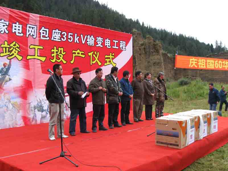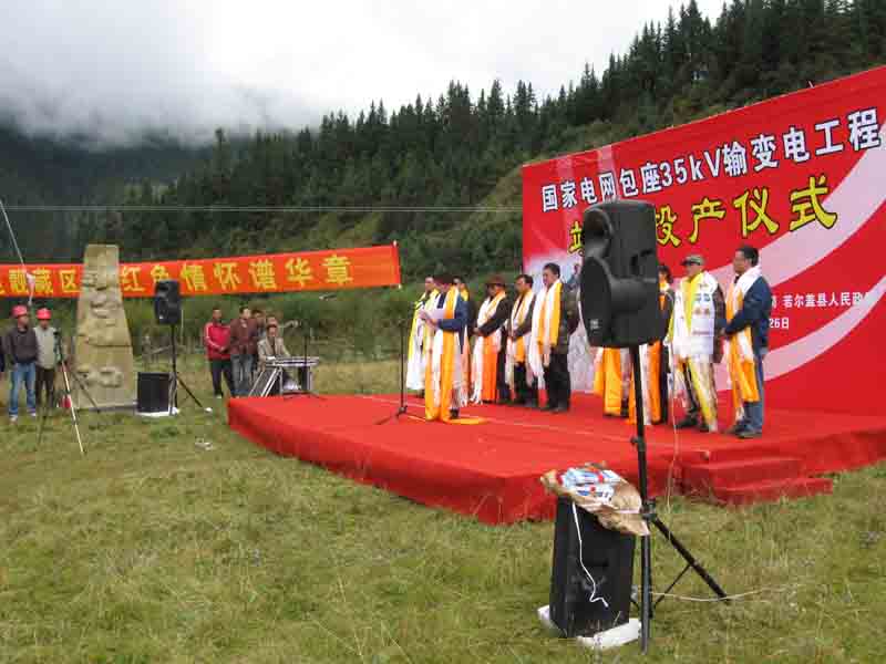 本工程于2009年9月26日順利通電,上級(jí)部門(mén)接到這一喜訊后,由四川電力阿壩公司、若爾蓋縣電力公司、若爾蓋政府、若爾蓋林業(yè)局、阿壩州新聞媒體等有關(guān)部門(mén)組織了通電剪彩儀式。并給予我施工隊(duì)肯定的表彰。當(dāng)?shù)卮緲愫┖竦哪撩褫d歌載舞給我施工隊(duì)獻(xiàn)上了潔白的哈達(dá)和光榮的錦旗。